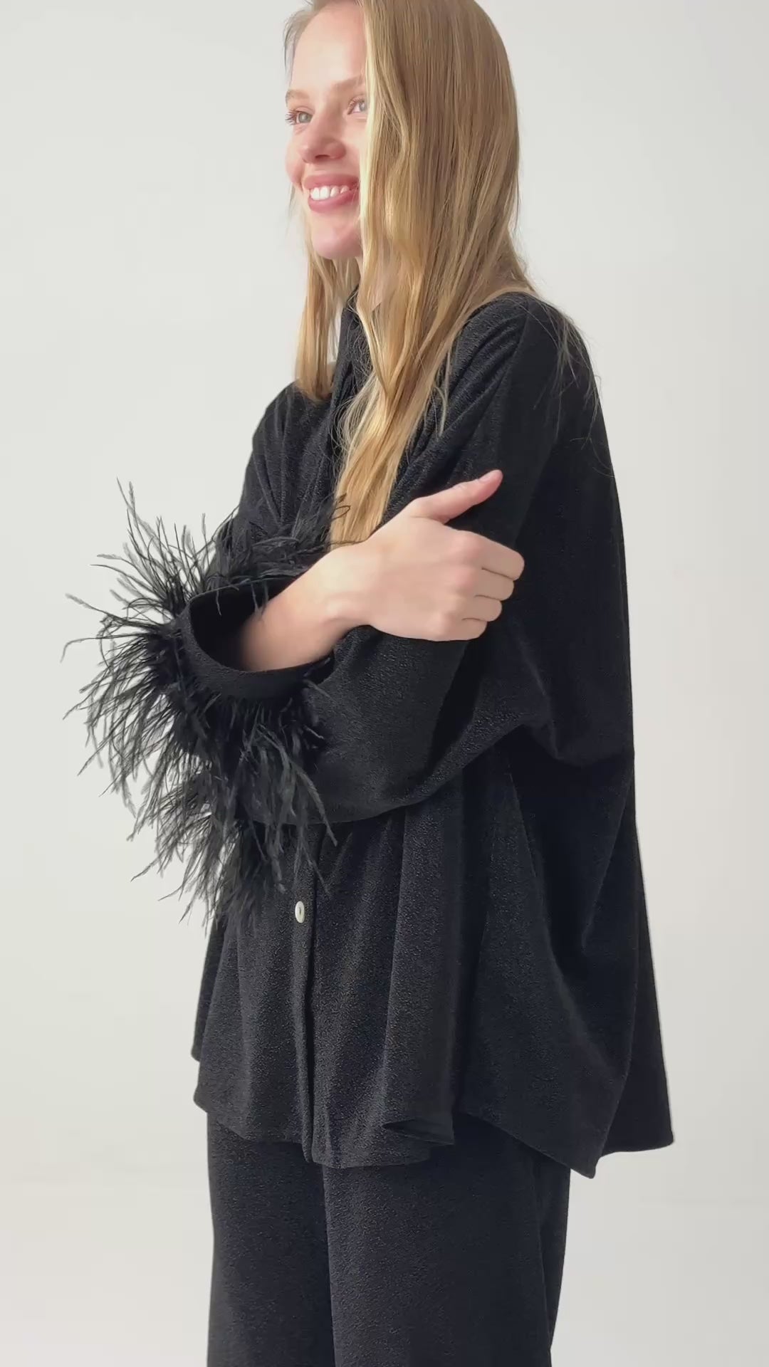 Oversized pajama shirt and pants set in shimmering black lurex, generously cut for a comfortable fit. The shirt's fitted collar is followed by mother-of-pearl buttoning, while the gently-cropped pants have an elasticated waistband. Each piece is trimmed with a double layer of detachable ostrich feathers.