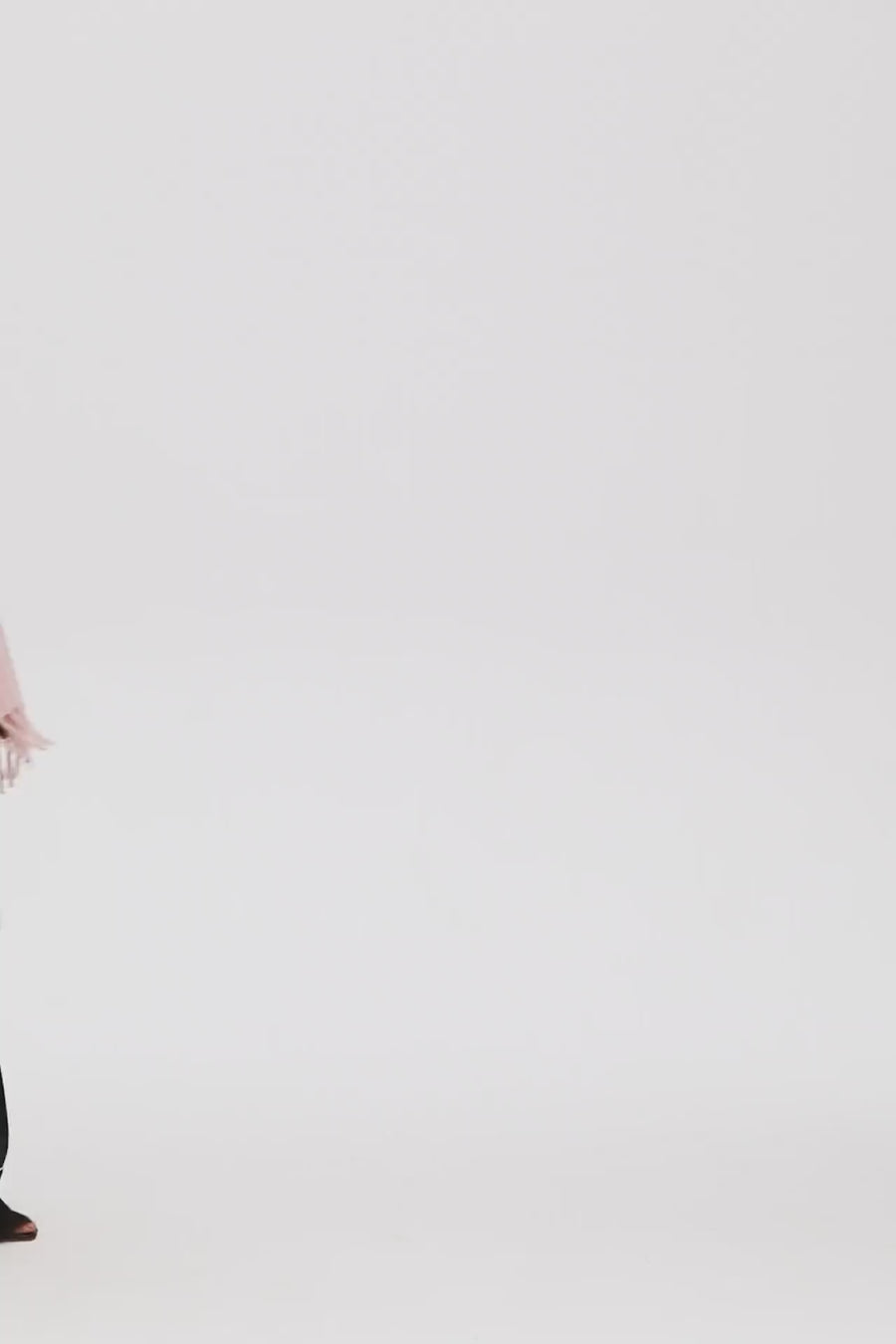 Oversized poncho in pink, woven from a warm blend of alpaca wool and fleece. The loose, unlined structure is detailed with a fringed trim at the bottom edge. Wear as outerwear, or wrap up in it as a blanket.