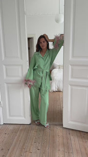 Relaxed set in mint, crafted in silky viscose fabric, with a shirt that includes contrast piping along the collar, long sleeves with detachable feather cuffs, and patch pockets finished with piping for a refined touch. The shirt is paired with a piped belt for a defined waist, while the high-waisted trousers feature an elasticated waistband and piping at the bottom for a sleek, comfortable fit.