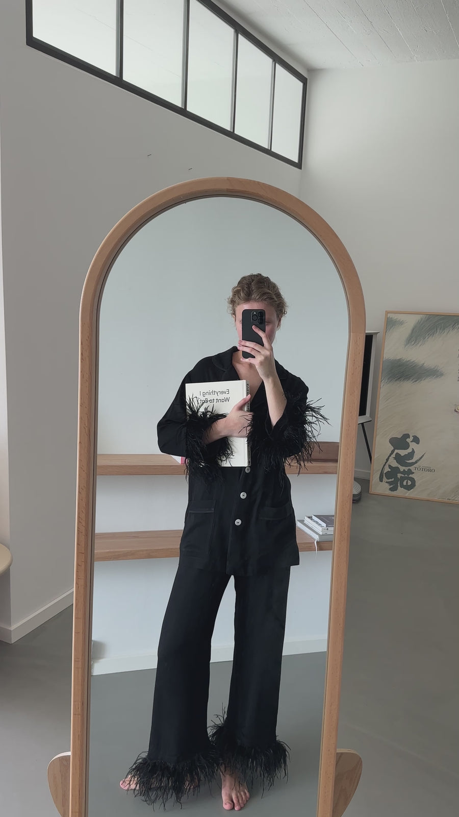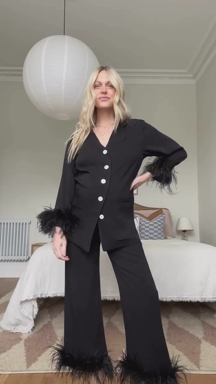 The signature SLEEPER party pajamas continue to be our best-selling style. A relaxed pajama shirt and pants set are cut from soft black certified viscose, trimmed with a double layer of detachable ostrich feather cuffs. The shirt features a cropped sleeve length, as well as tonal piping at the rounded collar, button closure and pockets. The pants sit below the hip with a comfortable elastic waistband and straight silhouette. The set pairs just as easily with slippers as it does with heels.