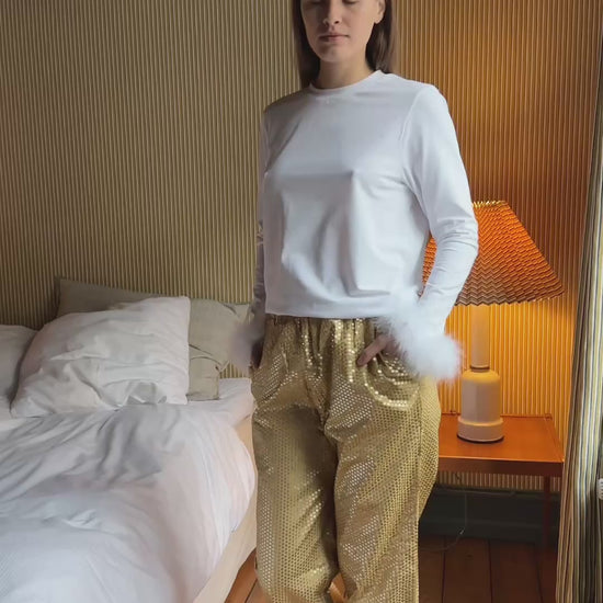The Holiday collection's standout piece, these wide-leg trousers feature striking sequin embellishments, adding a touch of sparkle to any festive outfit. The high waist is complemented by a drawstring fastening made from matching material for a tailored fit. Fully lined for comfort, these trousers are designed with two side inset pockets and a floor-length cut, making them perfect for pairing with the matching Supernova Sequined Shirt in Gold. This cohesive look offers a glamorous touch for holiday celebrations.