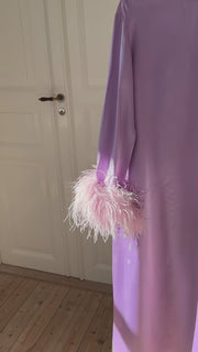 Designed for versatility, this maxi dress in Lavender offers a loose, flowing silhouette made from soft EcoVero™ rayon, certified by STANDARD 100 by OEKO-TEX® for environmental friendliness. The classic round neckline is complemented by a single pearl button loop at the back for closure, while the cuffs are enhanced with a generous layer of detachable ostrich feathers for an added element of sophistication. Perfect for day or night wear, this dress combines elegance with practicality, making it a versatile addition to any wardrobe.
