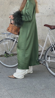 Green maxi dress designed to wear on special occasions, and beyond. A loose silhouette is cut from gentle, breathable viscose with a STANDARD 100 by OEKO-TEX® certification. Its round neckline closes at the back with a single pearl button loop, while sleeve cuffs are finished with a generous layer of detachable ostrich feathers.
