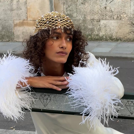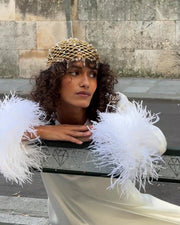 White maxi dress designed to wear on special occasions, and beyond. A loose silhouette is cut from gentle, breathable EcoVero™ rayon with a STANDARD 100 by OEKO-TEX® certification. Its round neckline closes at the back with a single pearl button loop, while sleeve cuffs are finished with a generous layer of detachable ostrich feathers.