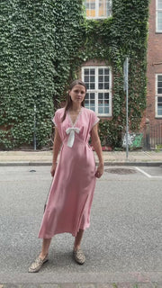 Relaxed satin midi dress made from certified EcoVero™ rayon in soft pink. The deep v-neckline features a handcrafted bow and lace trim, mirrored at the sleeves. A waist belt provides a custom fit, while subtle darts enhance the flared silhouette. Drawing inspiration from 1930s sleepwear, this dress balances vintage charm with contemporary ease.